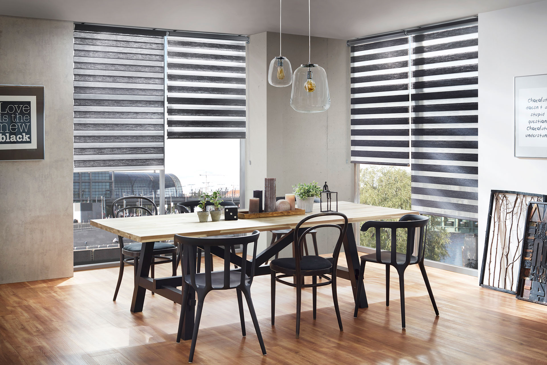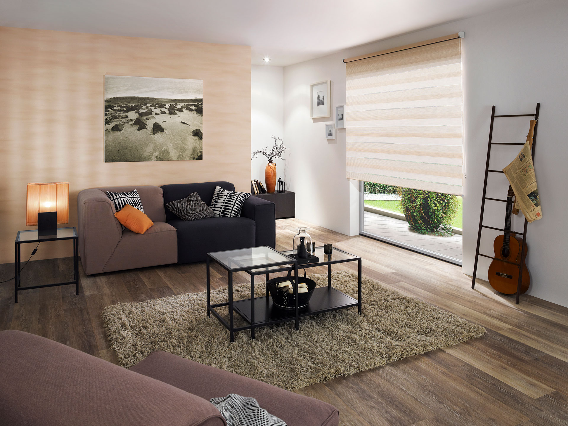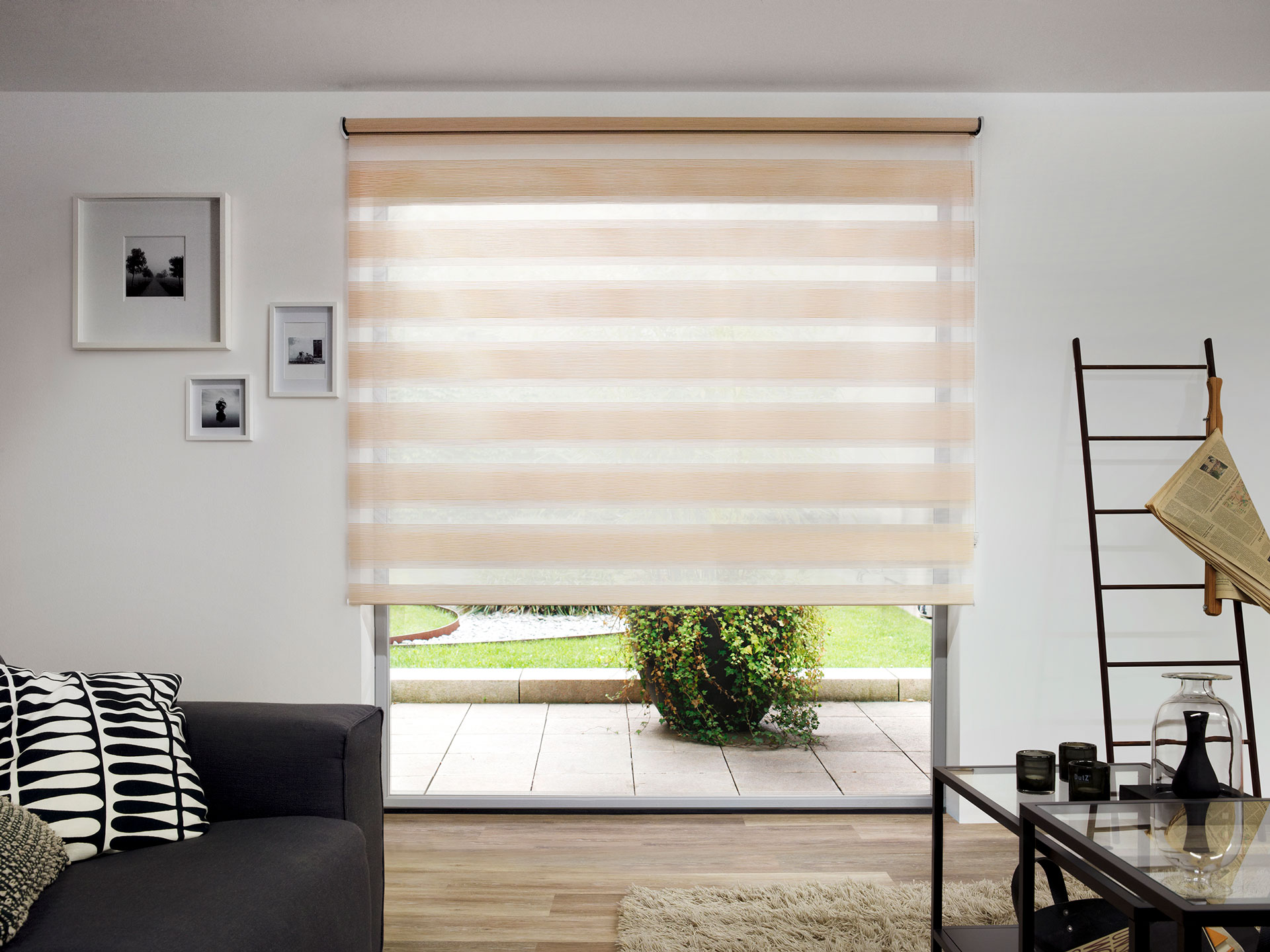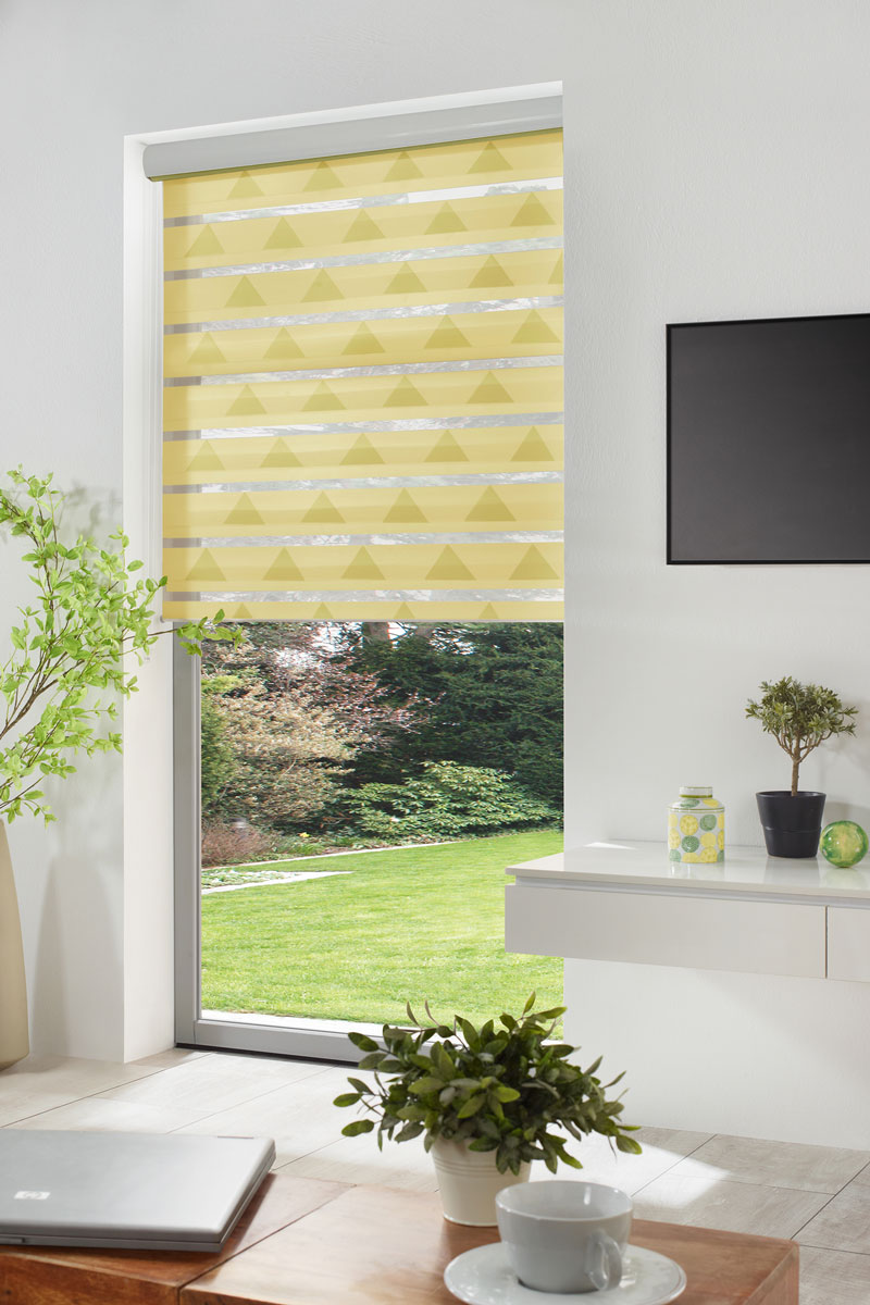 Mit dem raffinierten Doppelrollo ist es Ihnen möglich, das Licht im Raum auf eine besondere Weise zu regulieren. Es besteht aus zwei Schichten, die abwechselnd blickdichte und transparente gewebte Streifen haben. Je nach Position der Streifen lenken Sie Licht und Schatten in Ihr Zuhause.