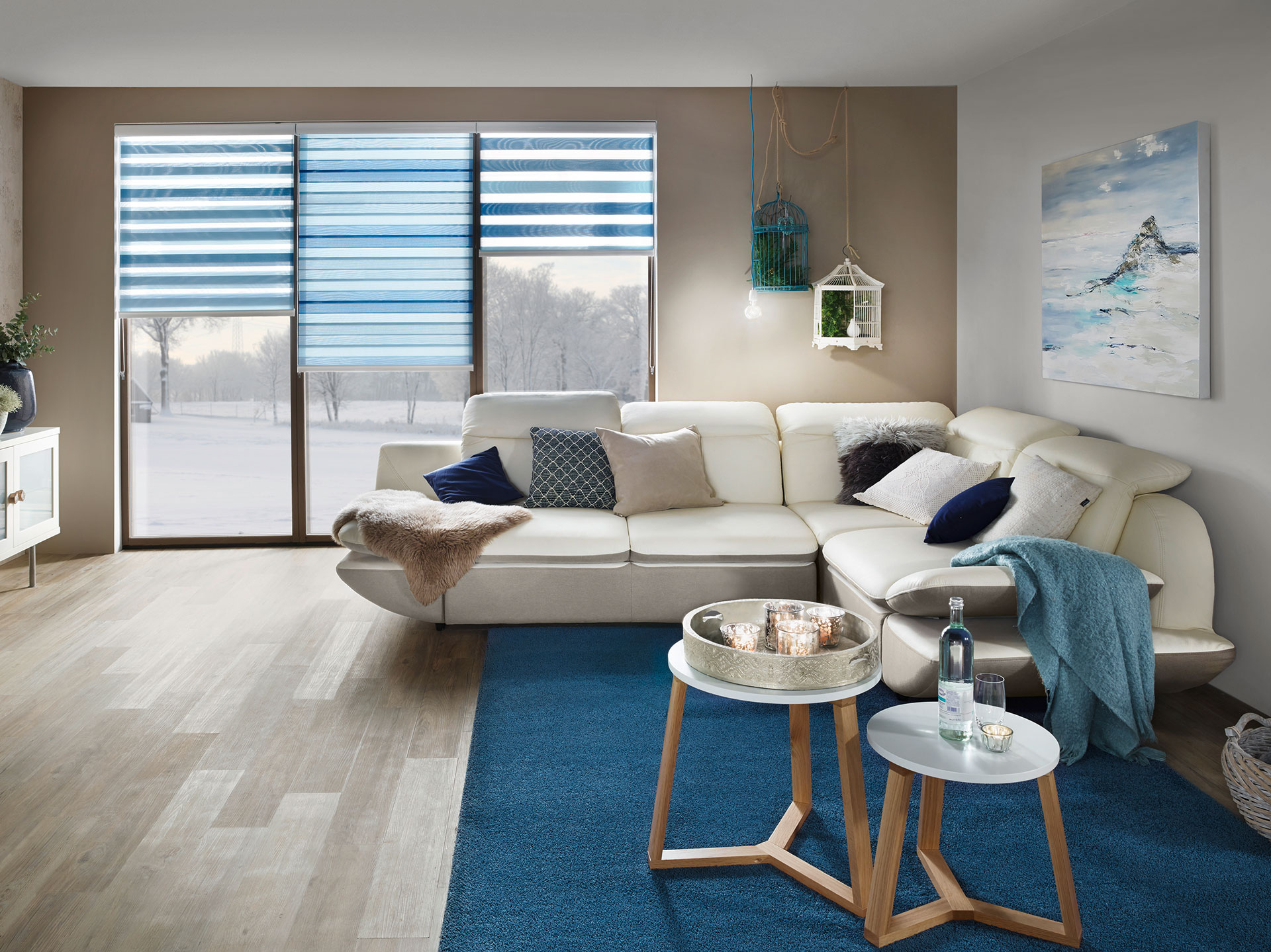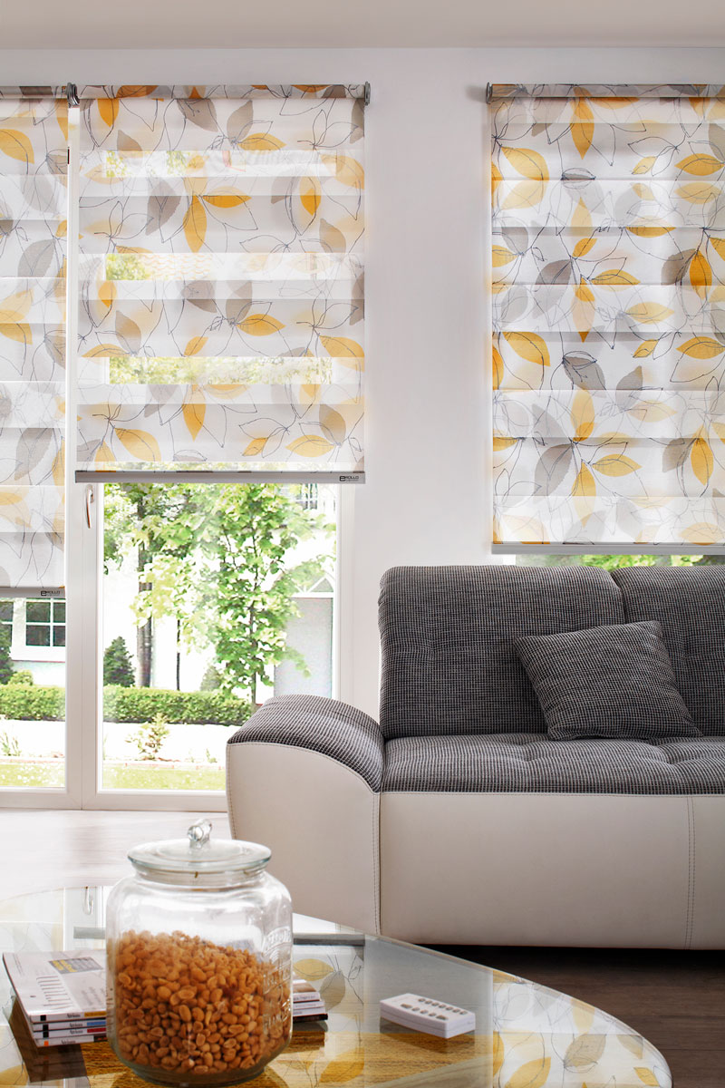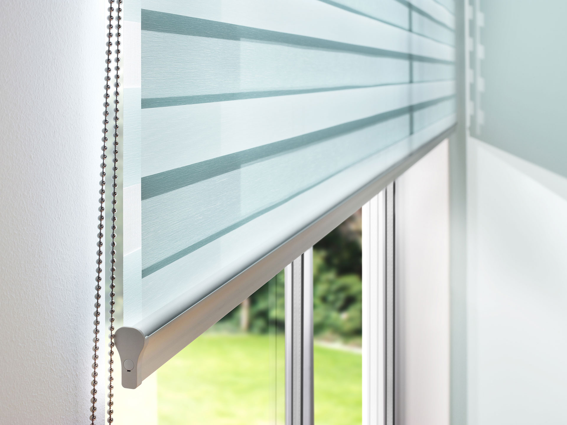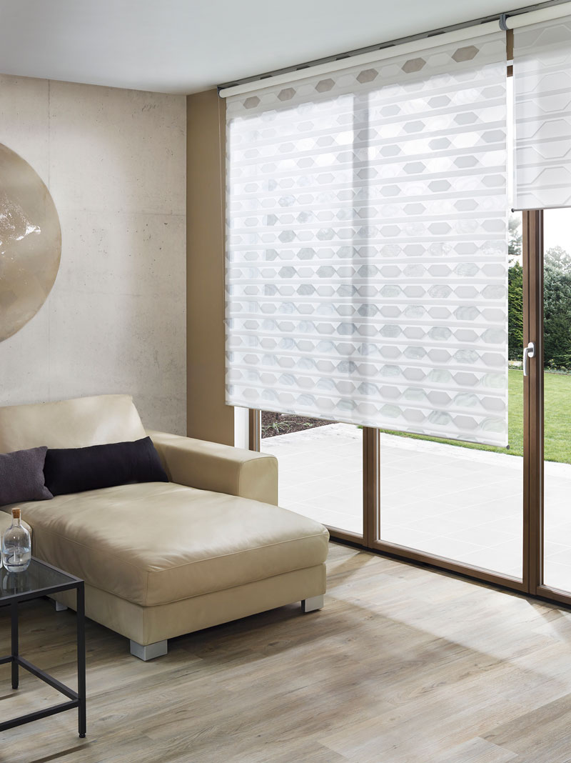 Mit dem raffinierten Doppelrollo ist es Ihnen möglich, das Licht im Raum auf eine besondere Weise zu regulieren. Es besteht aus zwei Schichten, die abwechselnd blickdichte und transparente gewebte Streifen haben. Je nach Position der Streifen lenken Sie Licht und Schatten in Ihr Zuhause.