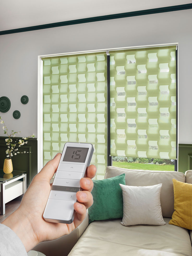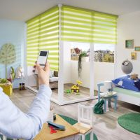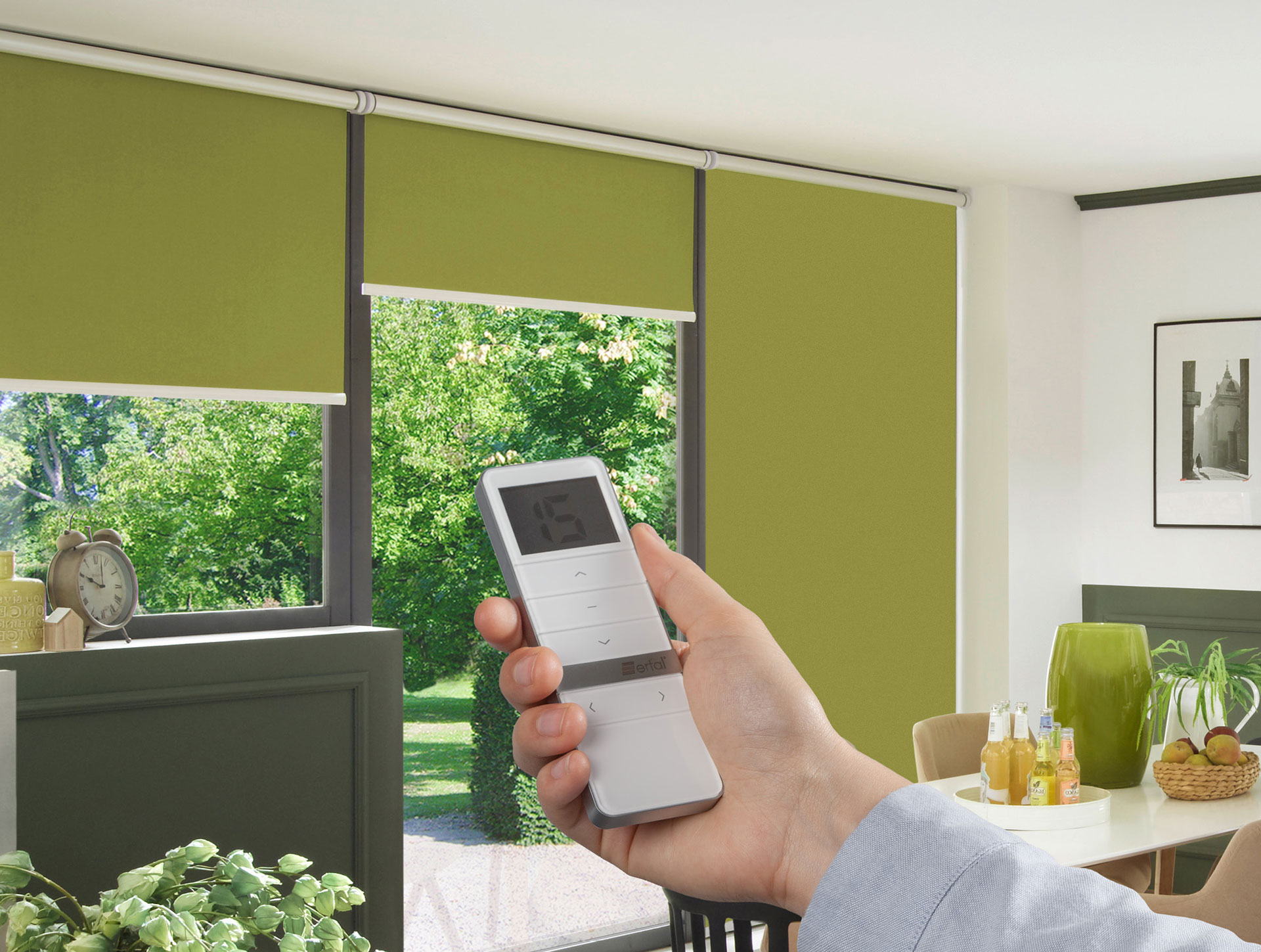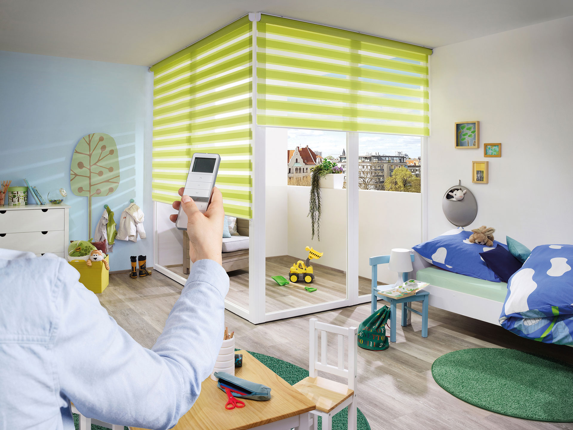 Für die besonders komfortable Bedienung können Flächenvorhänge natürlich auch elektrisch mit Fernbedienung betrieben werden.